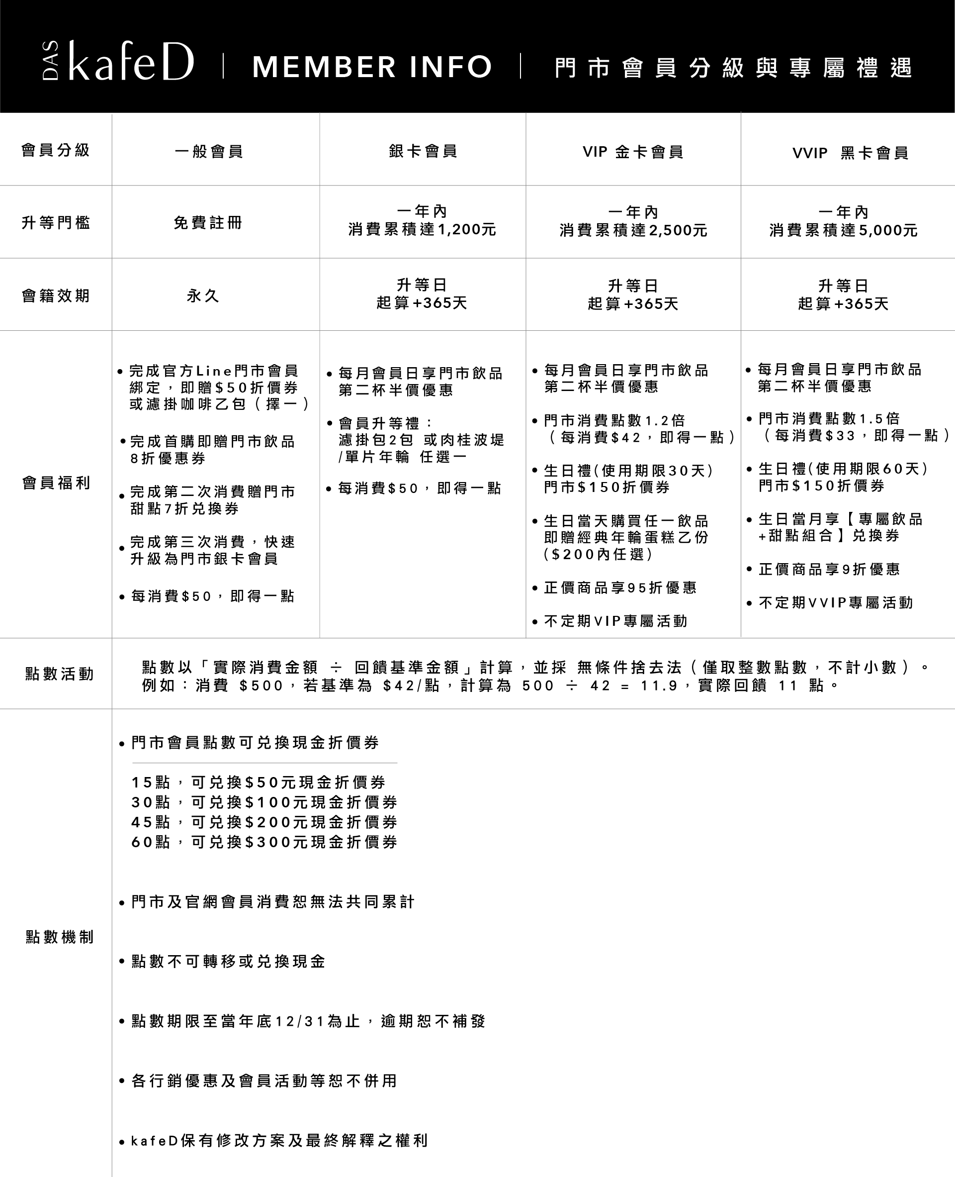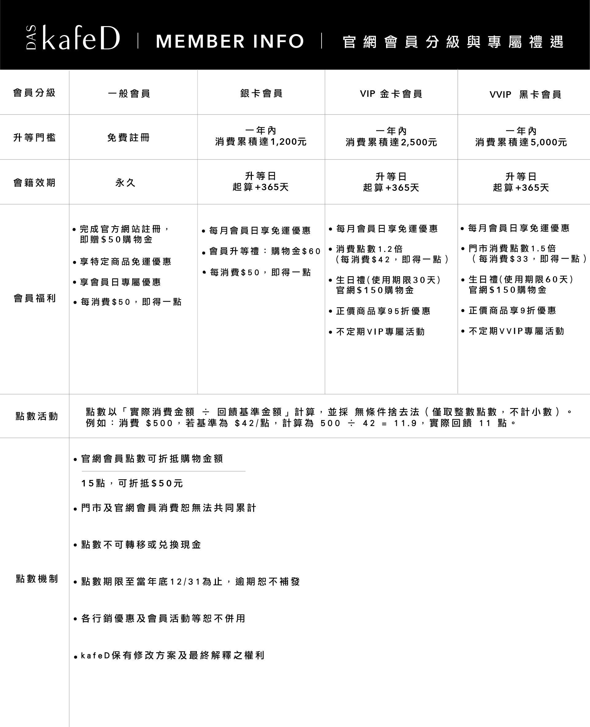 為了提供您更優質的服務與體驗,kafeD 已於 2025/10/01 起調整會員制度,帶來全新升級的會員權益!