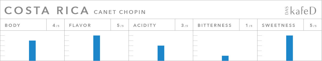 葡萄乾蜜處理使得咖啡風味濃郁,果膠保存更高,帶來明確的莓果果乾風味,甜美如白蘭地般餘韻,並帶有濃厚的莓果果乾酸質,如蕭邦音樂般浪漫悠揚。